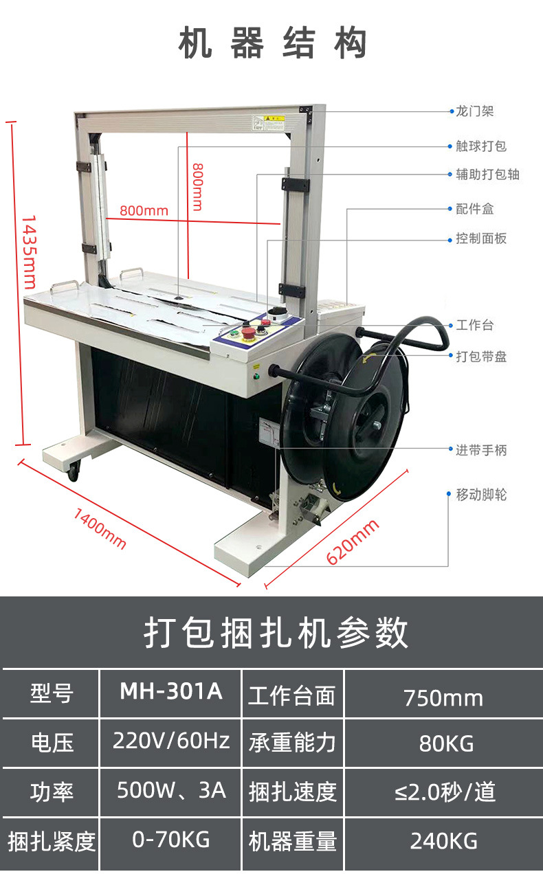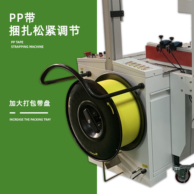 封箱打包機在封箱后的紙箱繼續前進到打包區域后,打包帶供給系統將打包帶從卷帶中抽出,繞過紙箱