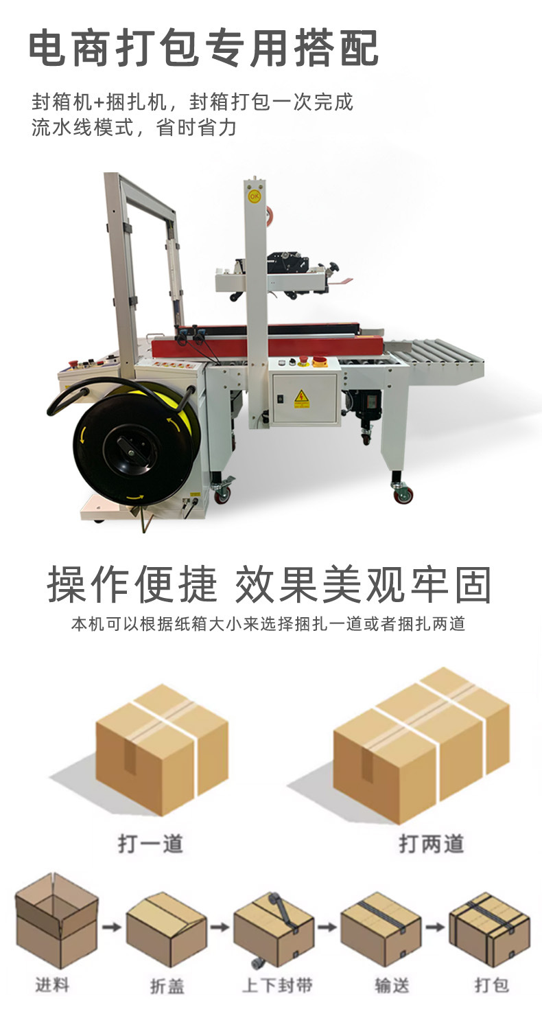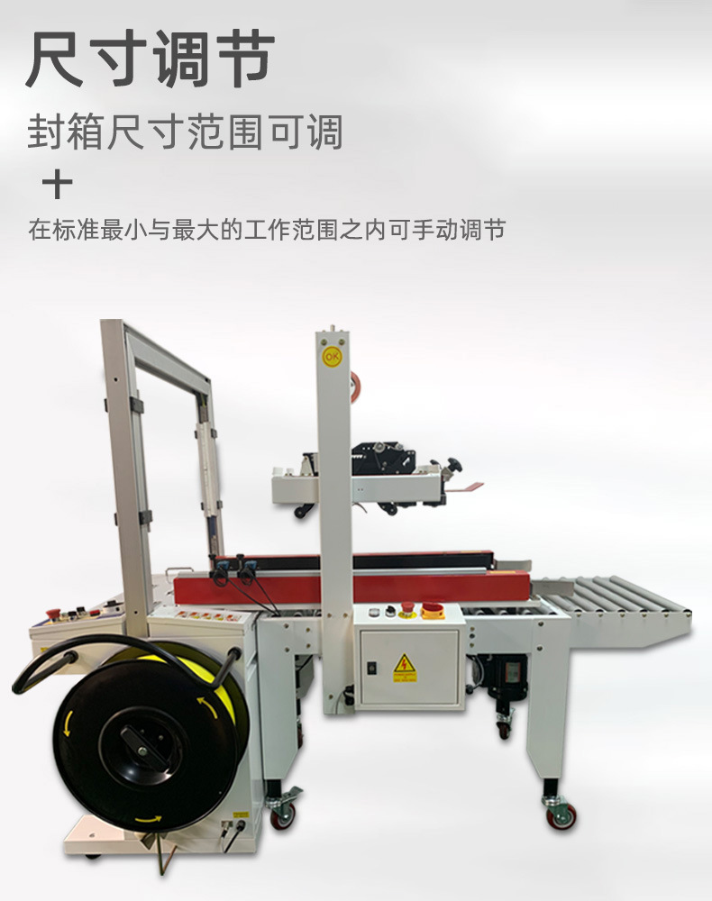 • 廣泛的適應性:可以適應多種尺寸和形狀的紙箱。通過調整輸送系統的參數、折疊機構的位置以及打包帶供給和拉緊的力度等,能夠對不同長度、寬度、高度的紙箱進行有效的封箱和打包。同時,它還能兼容多種類型的膠帶和打包帶,如不同寬度的膠帶、PP(聚丙烯)或 PET(聚對苯二甲酸乙二醇酯)打包帶等,滿足不同的包裝需求。