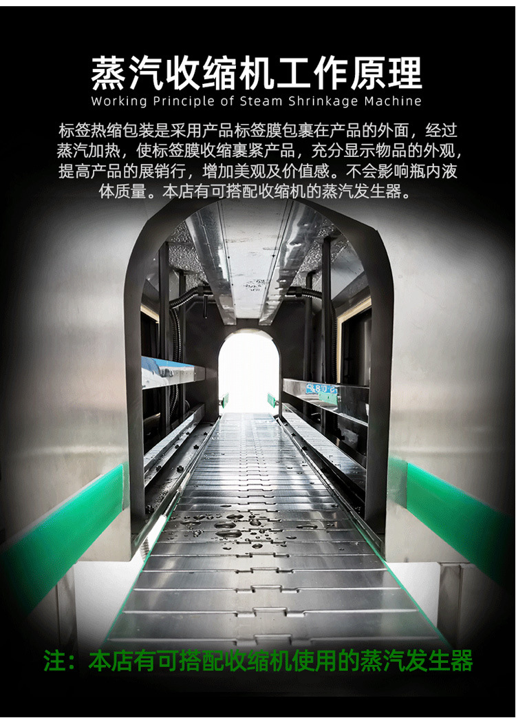 - 蒸汽輸出量:蒸汽輸出量越大,在單位時間內能夠處理的產品數量就越多。例如,一些大型的蒸汽標簽收縮機每小時可以處理數千瓶甚至更多的產品,而小型設備的蒸汽輸出量有限,每小時可能只能處理幾百瓶。