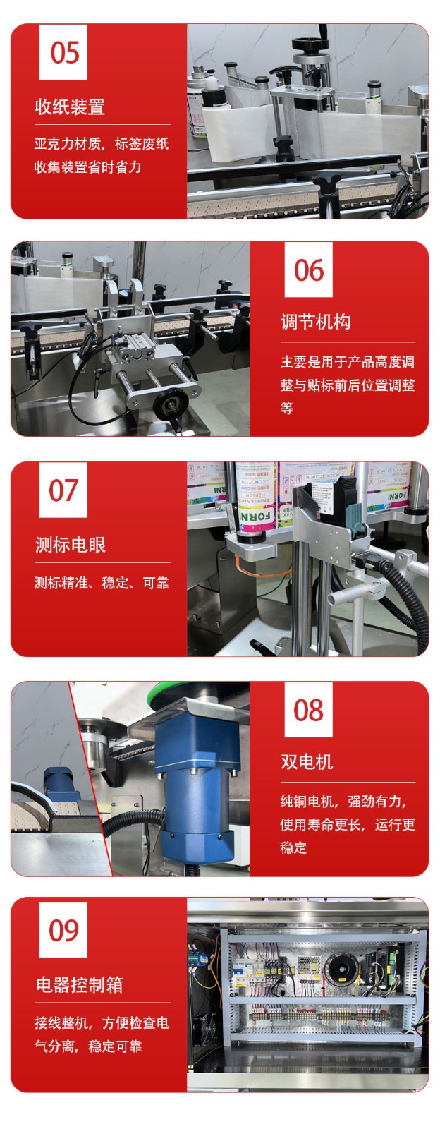 圓瓶類產(chǎn)品的貼標(biāo),可貼單標(biāo)和雙標(biāo),正背雙標(biāo)間距可靈活調(diào)整,部分機(jī)型還具備錐形瓶貼標(biāo)功能。精準(zhǔn)定位、高效智能、靈活兼容與合規(guī)耐用,可顯著提升產(chǎn)線自動(dòng)化與貼標(biāo)良率。