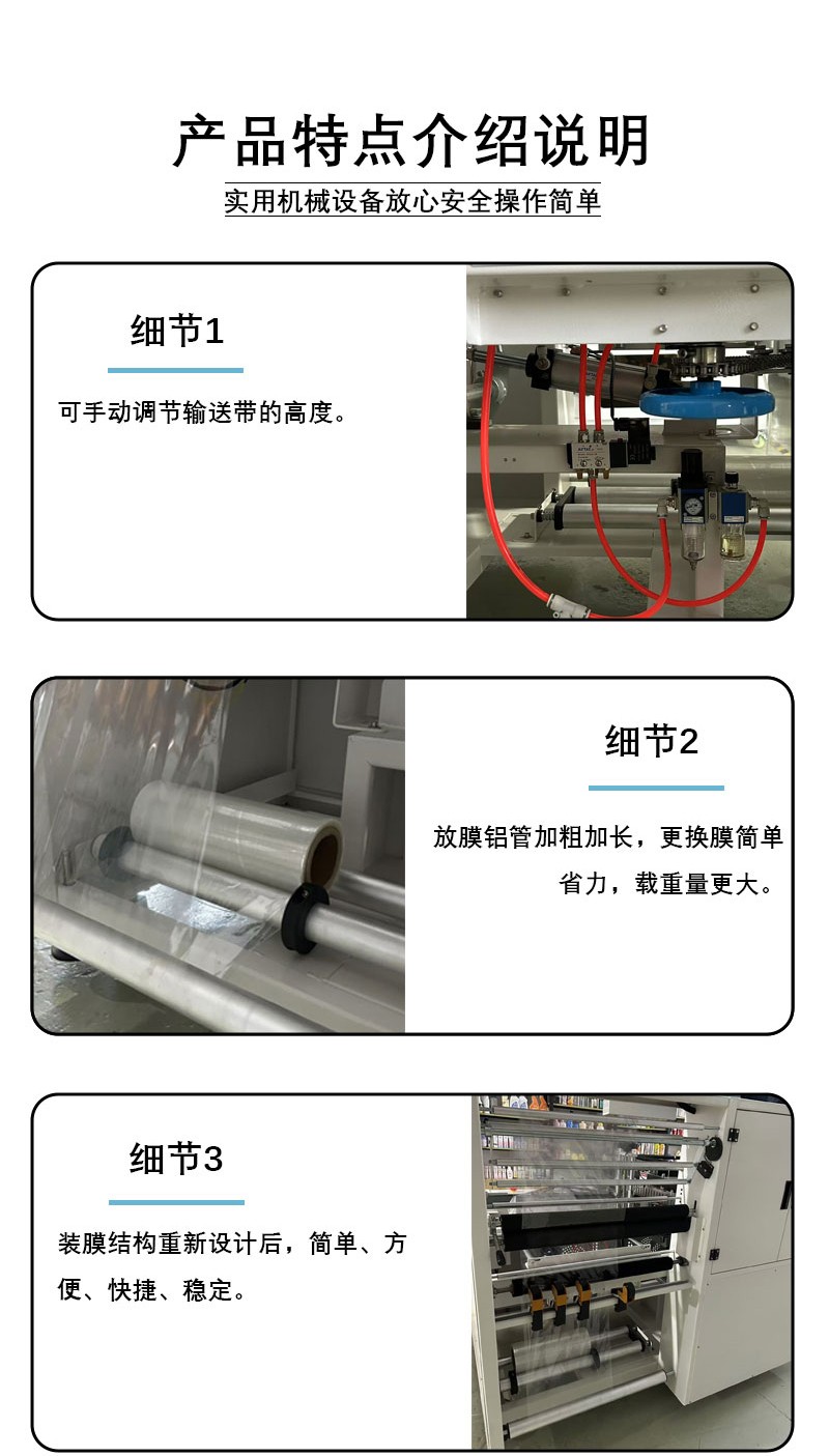 • 節能環保:采用更節能的加熱技術和電機系統,降低能耗;使用環保型收縮薄膜材料,減少對環境的影響,符合可持續發展要求 。