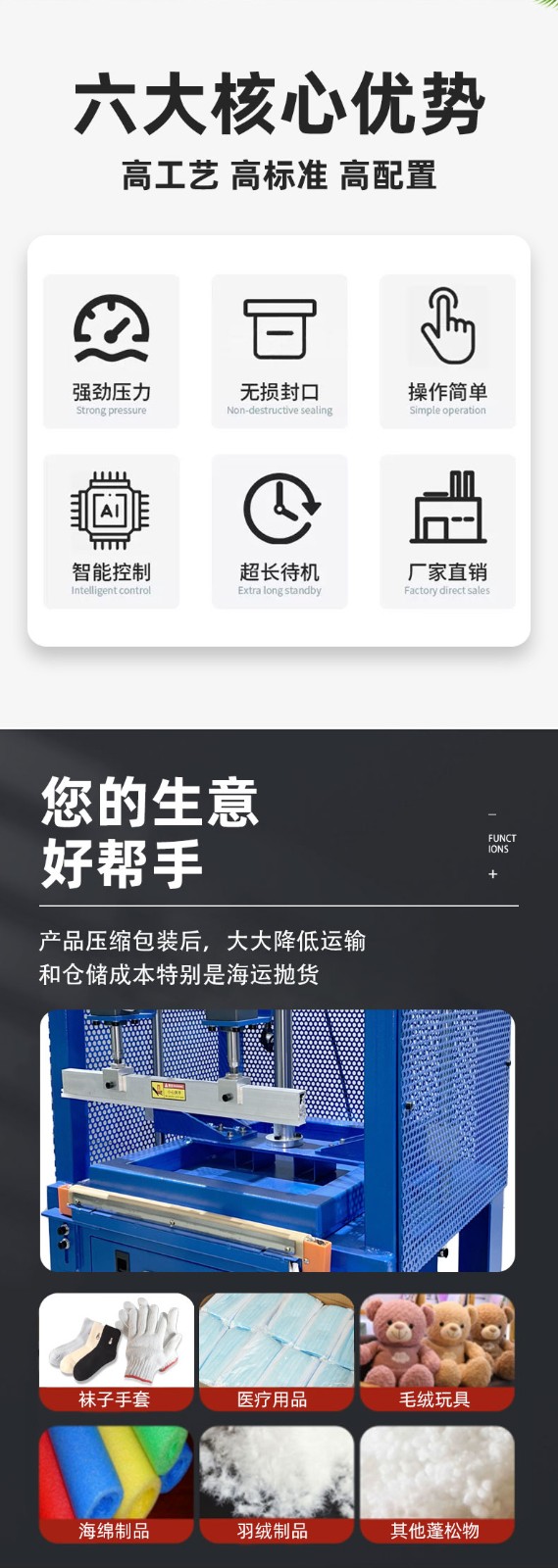- 其他行業:如紡織品、皮革制品、化工原料等,也可采用壓縮真空封口包裝,起到防潮、防霉、防蟲蛀等作用,便于儲存和運輸