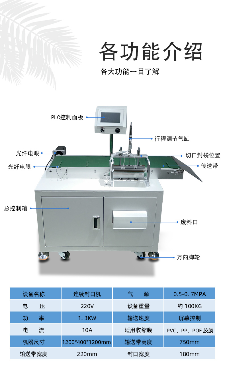 • 連續(xù)式氣動封切機(jī)整體結(jié)構(gòu)較為緊湊,通常由機(jī)身框架、封切機(jī)構(gòu)、輸送機(jī)構(gòu)、控制系統(tǒng)操作面板以及防護(hù)裝置等部分組成。機(jī)身框架采用堅固的金屬材料制成,能夠穩(wěn)定支撐各部件并承受一定的工作負(fù)荷。封切機(jī)構(gòu)位于機(jī)器的上方或特定工作區(qū)域,包含氣動缸、封切刀等關(guān)鍵部件,氣動缸通過連接部件與封切刀相連,以提供動力實現(xiàn)封切動作。輸送機(jī)構(gòu)貫穿機(jī)器,由輸送帶、驅(qū)動滾筒、電機(jī)等組成,輸送帶一般采用耐磨、耐高溫的材料制成,可根據(jù)不同的包裝需求選擇合適的寬度和長度。控制系統(tǒng)操作面板通常安裝在機(jī)器的側(cè)面或便于操作的位置,上面設(shè)有各種按鈕、旋鈕和顯示屏,用于設(shè)置封切參數(shù)、控制機(jī)器運行狀態(tài)等。防護(hù)裝置則安裝在機(jī)器的危險區(qū)域周圍,如封切刀附近,以防止操作人員意外接觸到運動部件或高溫部件,保障人員安全。