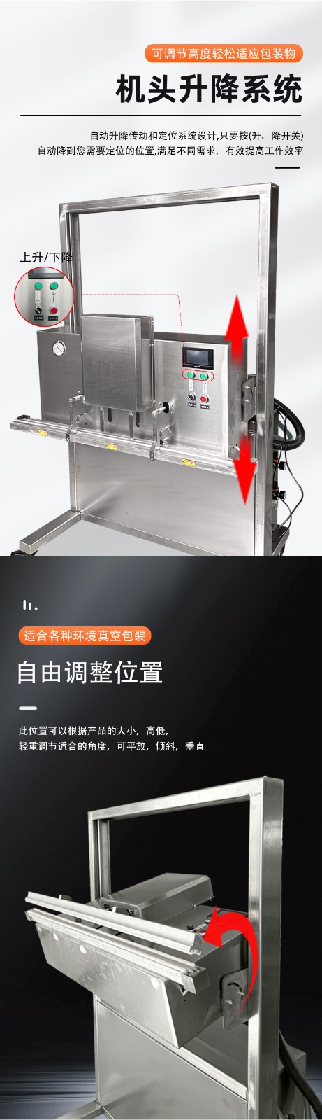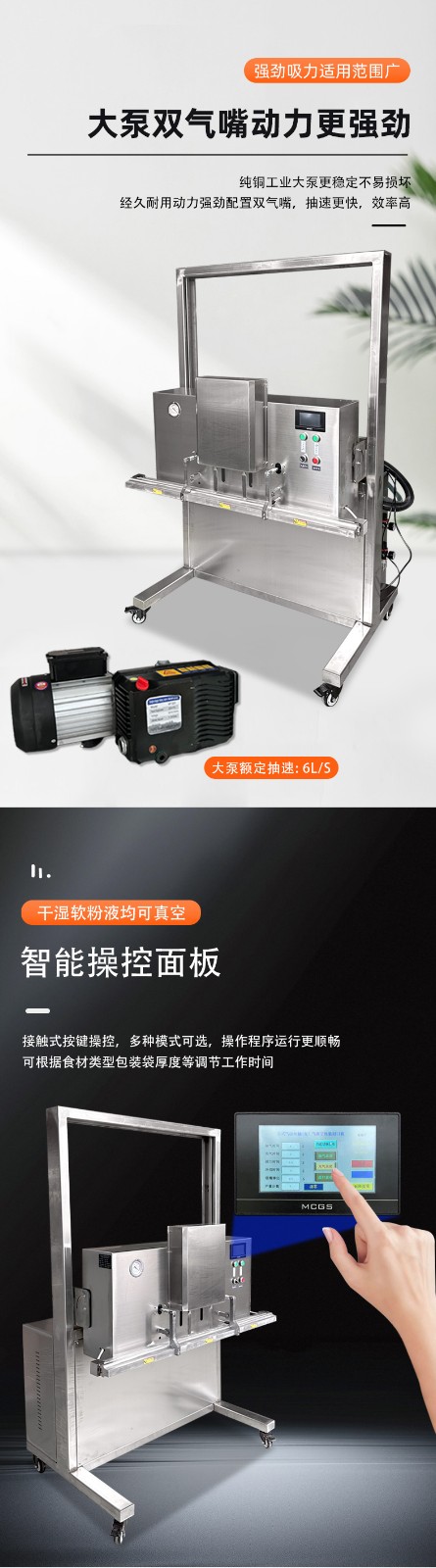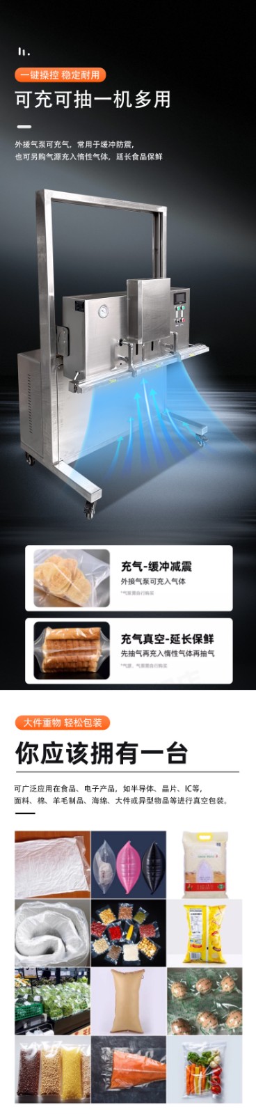適用于需通過真空隔絕空氣、防止氧化變質(zhì),或通過充氣(如氮?dú)猓┚S持口感的食品,尤其適配大份量 / 大尺寸食材: